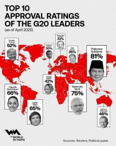 “Presiden Indonesia, Prabowo Subianto, menempati posisi teratas dengan tingkat kepuasan hampir 81 persen setelah 100 hari pertama masa jabatannya,” demikian pernyataan The World in Maps di akun @the.world.in.maps.